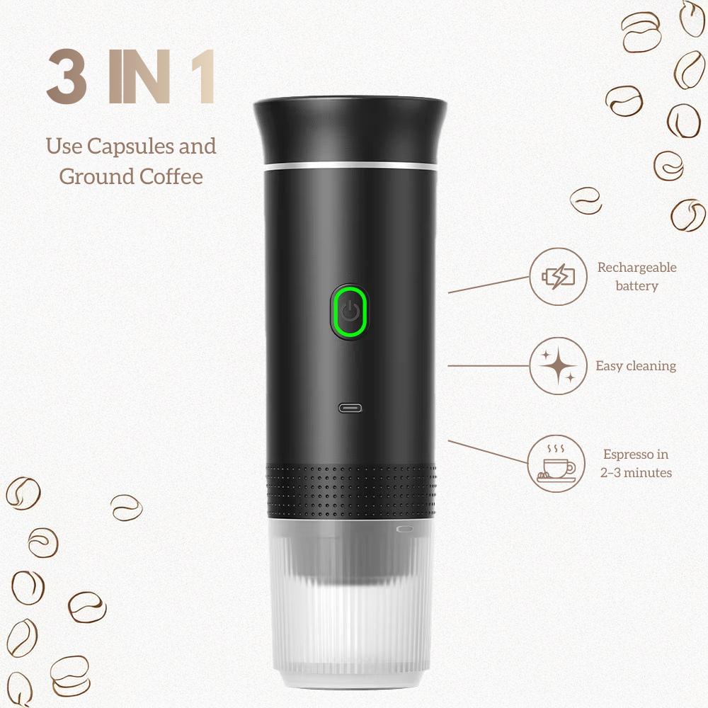 For the price, this portable coffee machine exceeded my expectations. It supports capsules and ground coffee, heats water well, and produces a good quality espresso. Perfect as a backup or travel coffee maker.